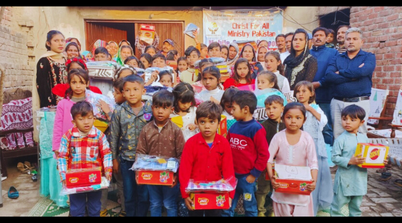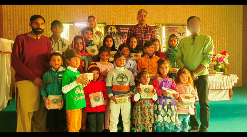 Subsequently, the team visited the Clerk Abad Mobile Sunday School, where 39 regular attendees are under the guidance of Ms. Sumiya Imran. The children and their teacher had prepared a wonderful Christmas program, which commenced with prayer and a recitation from the Holy Bible. The children presented various tableaus and sang Christmas carols, followed by a cake-cutting ceremony with the CFAM team and parents. The CFAM team expressed their appreciation by presenting colorful Christmas clothes and sneakers as Christmas gifts to the attendees.